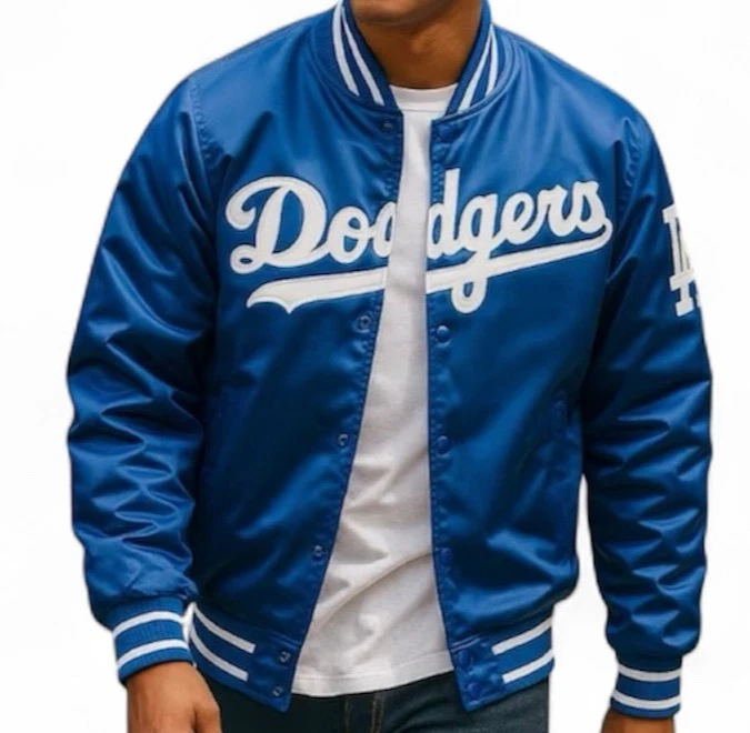 The Blue LA Dodgers Satin Varsity Bomber Style Jacket is a unisex outerwear piece perfect for travel, parties, or casual wear. Made from satin with polyester lining , this jacket features embroidered accents and a stand-up collar. Handmade in Pakistan, this lightweight bomber jacket has a mid-length cut and offers warmth for all seasons. The blue color and 90s theme make it a stylish choice for baseball and football enthusiasts, adding a touch of retro flair to any wardrobe.